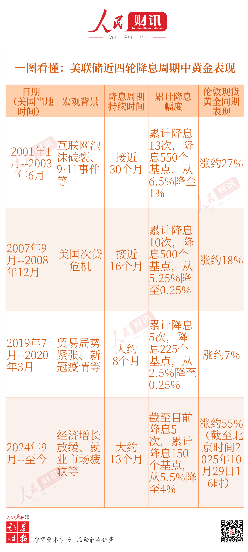 从2000年以来,美联储共经历了四轮降息周期。每一轮降息周期,黄金都有所上涨。其中,前三轮完整的降息周期中,美国经济均面临较大事件冲击;同时,降息周期持续时间较长的话,黄金上涨幅度也较大。最新一轮降息周期中,伦敦现货黄金涨幅已约55%(截至北京时间2025年10月29日16时),远大于前几轮降息周期时的涨幅。